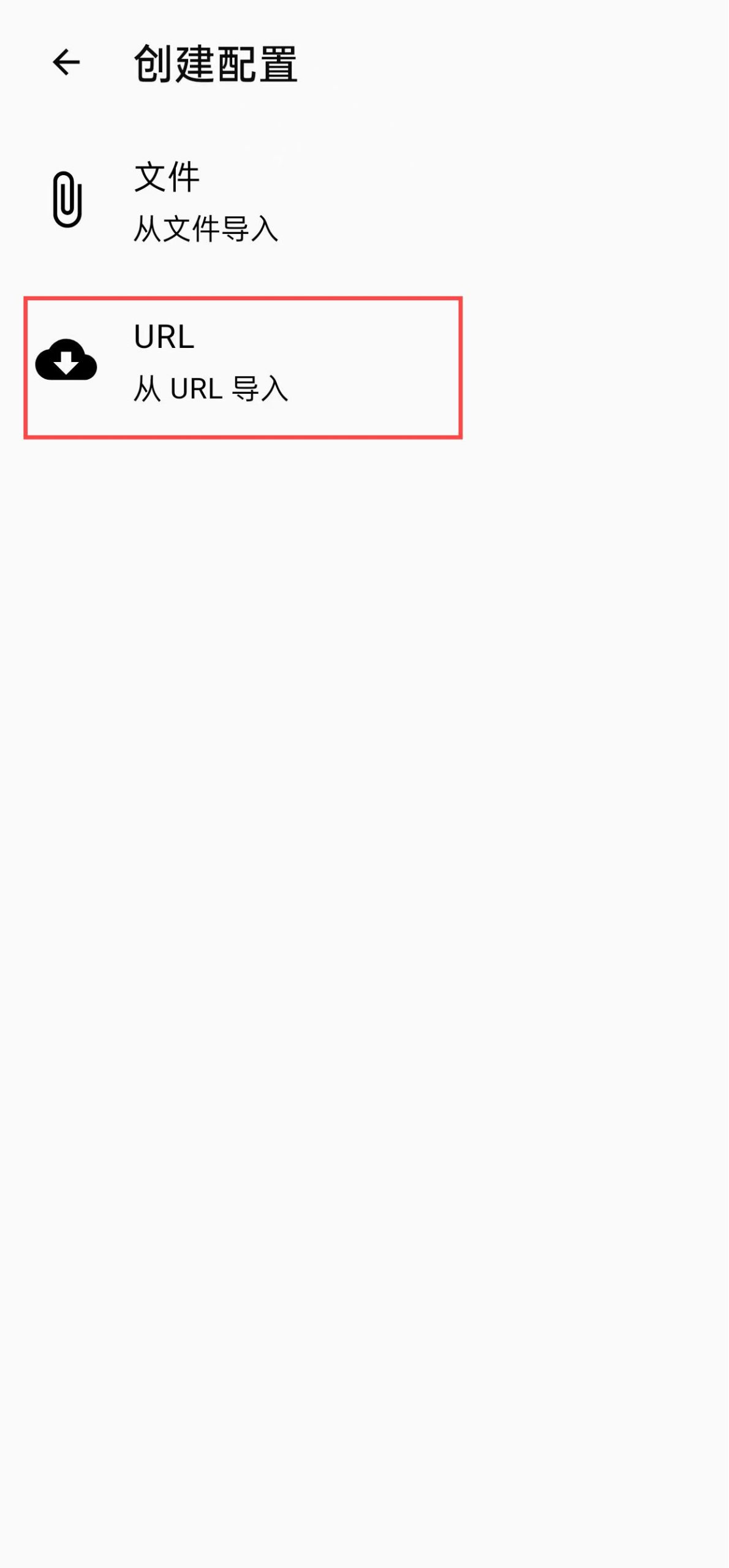 复制订阅地址,打开 Clash for Android 客户端,点【配置】按钮,再点右上角【+】并选择从URL导入,如下图所示: